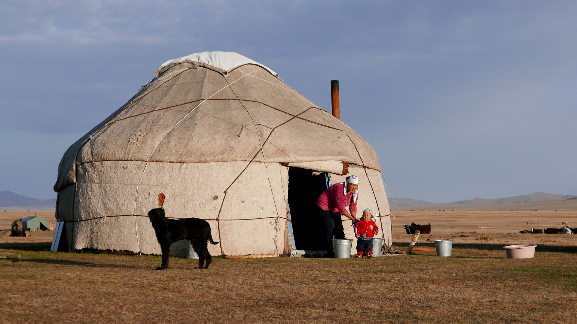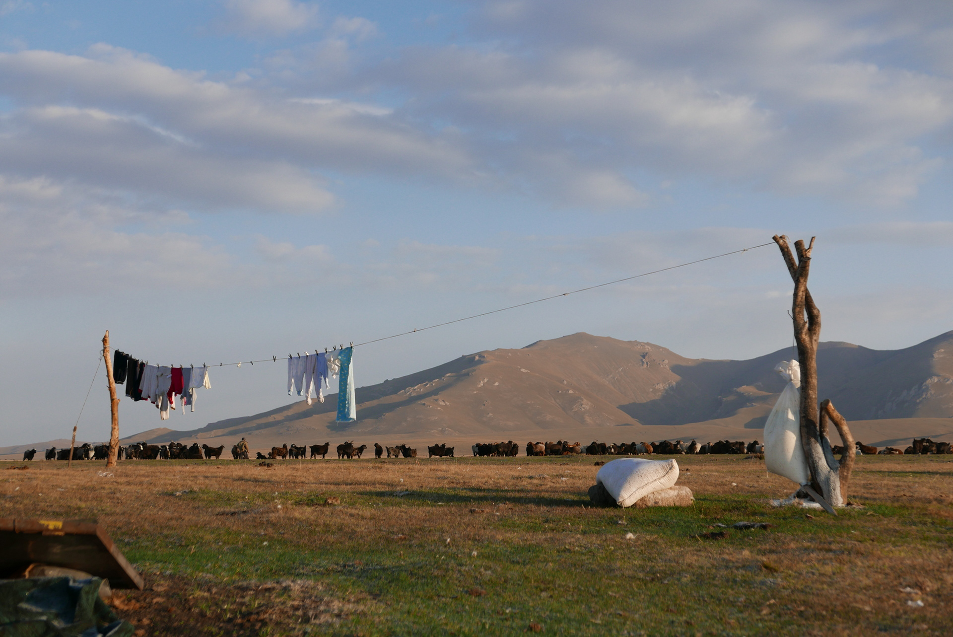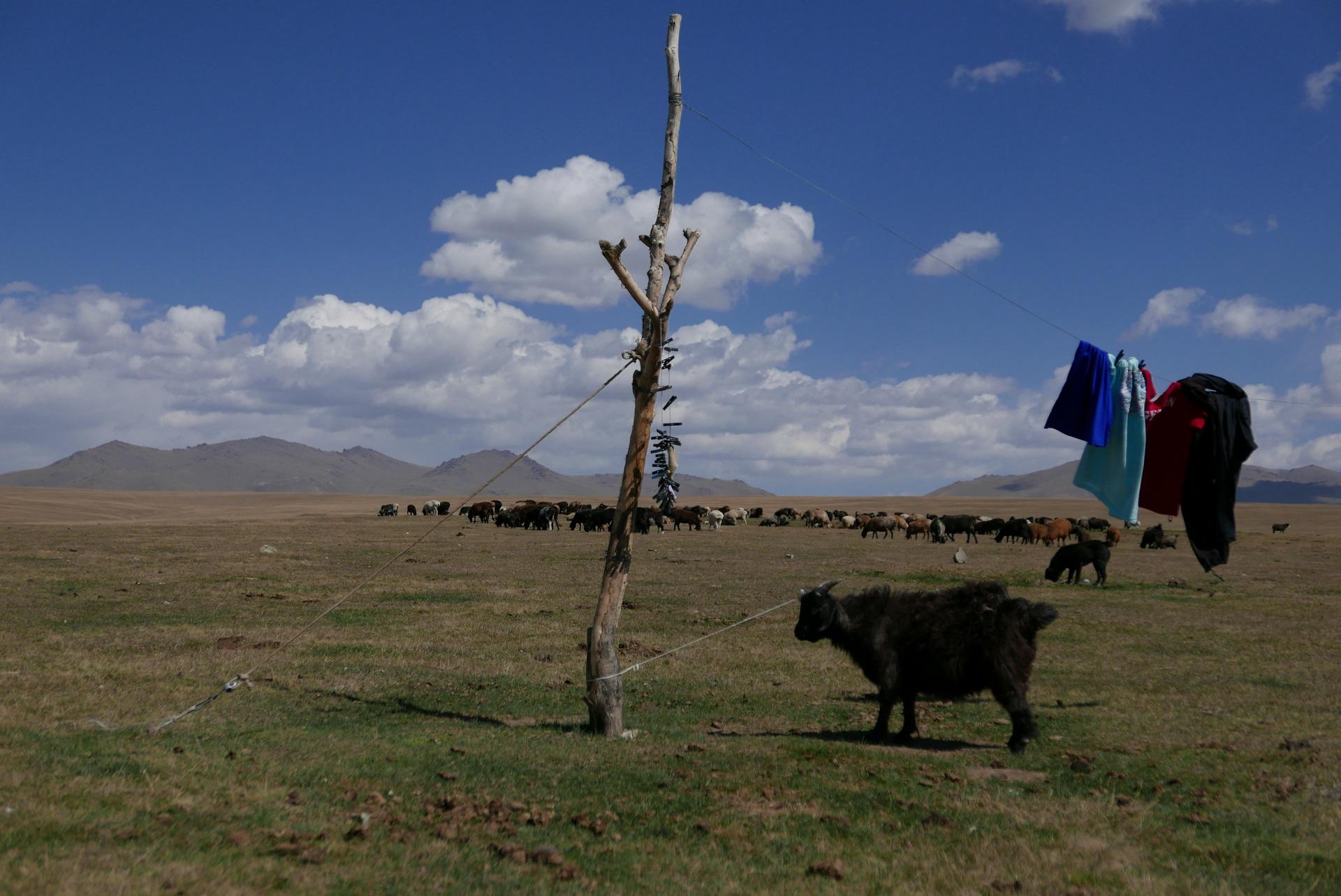 De nombreux kirghizes vivent selon un mode de vie semi-nomade. Pendant les mois les plus froids de l'année, les nomades vivent dans de petits villages. La fonte des glaciers résultant du réchauffement climatique à une répercussion directe sur les pâturages qui manquent d'eau. Ils continuent malgré tout de faire pousser leurs yourtes là où seuls les gestes essentiels rendent beau le moment partagé avec eux.